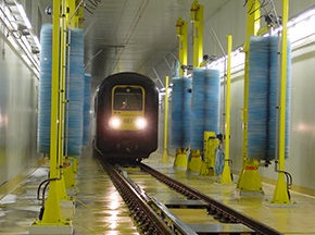 鐵路列車自動清洗機可實現(xiàn)對列車車廂、火車頭等外面進行全面、徹底的自動清洗,設(shè)備主要由噴淋系統(tǒng)、洗刷系統(tǒng)、干燥系統(tǒng)、水處理系統(tǒng)(選配)、預警系統(tǒng)及控制系統(tǒng)等組成,可通過噴淋濕潤、預備洗刷、洗滌洗刷、漂洗洗刷和吹掃干燥等不同的清潔方式,配合列車勻速通過清洗工作場地除去列車表面的塵埃和污垢,達到運營列車潔凈要求。[查看詳情]